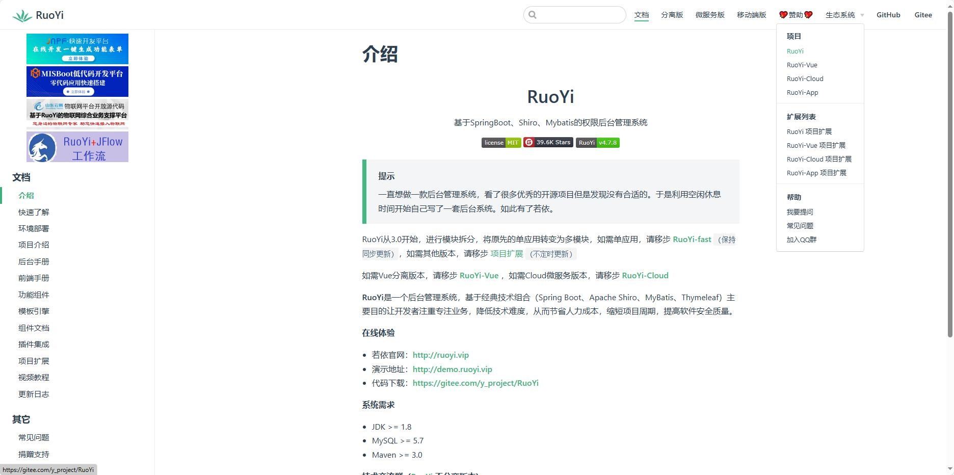 这个绝对是70%、80%的人都知道的项目,目前有单体版本、微服务版本。之前所在的公司有在使用前后端分离版本,里边后端主要使用的是Springboot + MybatisPlus + Mysql + Redis,里边有丰富的时间、UUID、String、IpAddress工具类,还有代码生成模块等等...