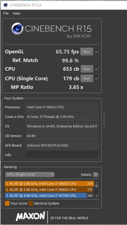 Cinebench R15测试多核分数653cb,单核179cb。MX150得分65.75fps。单核成绩基本超过了上一代i7-7700HQ标准电压的成绩,毕竟单核最高主频4.6GHz。