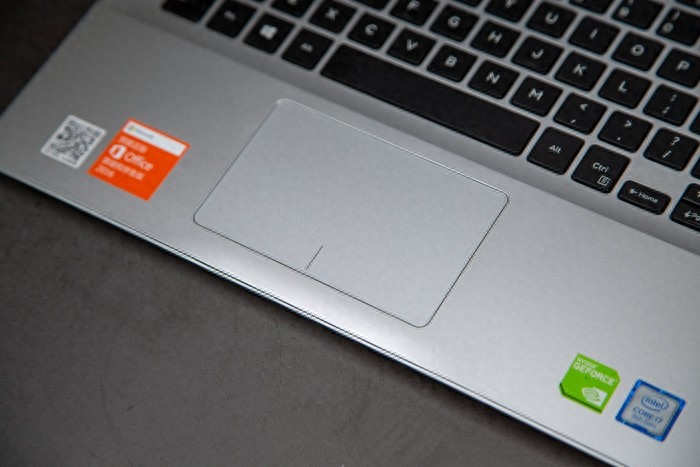 触控板区域不算很大,但是也支持多种手势设计。掌托两侧是各种贴纸,扫描二维码可以注册dell金牌服务。