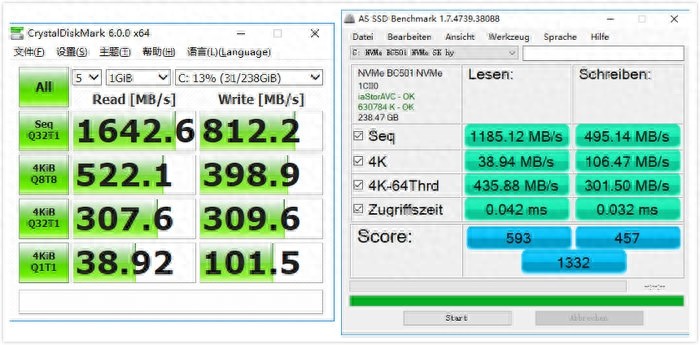 固态方面这款电脑标配的是海力士 BC501 NVMe 256GB固态硬盘,速度测试如下,虽然没有很顶级的速度体验。但是后面拆解也发现,固态安装在风扇位置下面方便更好的散热,预留的位置也是支持2280规格的M.2固态硬盘,方便后期对其升级更换。