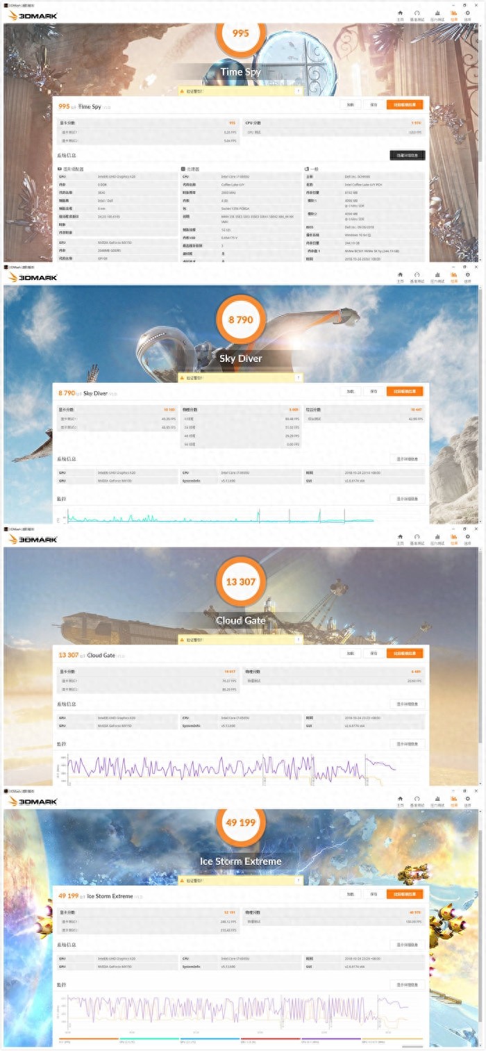测了一下3D Mark的成绩,主要是Time Spy分数995,Sky per 8790,Cloud Gate 13307,Ice Storm Extreme 49199.