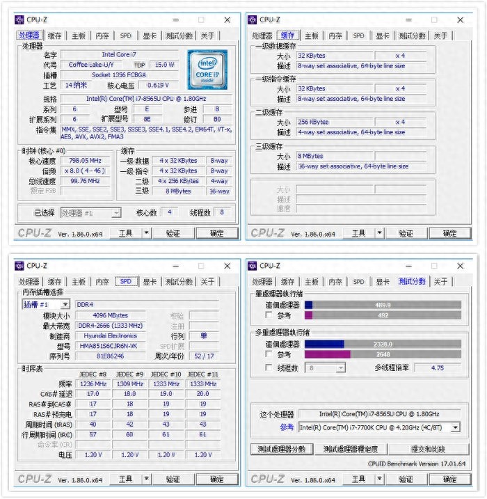 处理器方面算是“增强版八代酷睿”处理器中,专属笔记本的低电压版i7-8565U处理器的性能参数尤为显眼,最高可睿频至4.6GHz的性能以及15W的TDP让你发现其实intel毕竟还是intel,实力还是有的。内存方面双通道2666频率的DDR4代内存也是让这样的轻薄本像游戏本的性能看齐。CPU-Z测试可以看到单核性能得分489.9基本和i7-7700K桌面平台U的表现差不多,多核分数2328。
