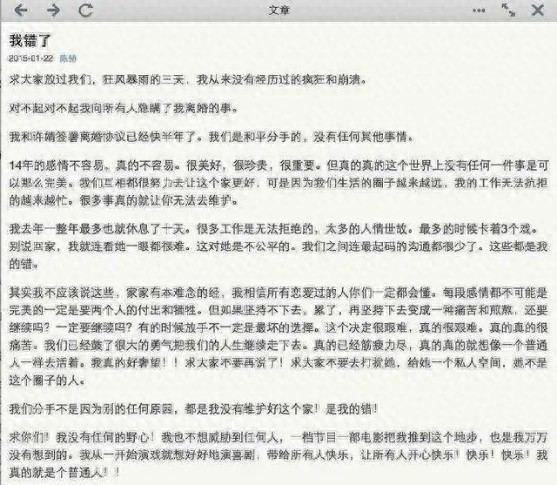 2015年1月22日晚,陈赫发了一篇名为《我错了》的微博长文,承认自己已离婚半年。