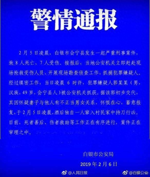 @白银公安 6日通报:2月5日凌晨,白银市会宁县发生一起严重刑事案件,致8人死亡、7人受伤。当日凌晨6时许,犯罪嫌疑人郭某某(男,汉族,49岁,会宁县人)被公安机关抓获。据该郭初步交代,其因怀疑妻子与他人有不正当男女关系,怀恨在心,蓄意报复,于2月5日凌晨,酒后独自一人窜入村民家中持刀行凶。目前,死者善后、伤者救助等工作正在有序进行,案件正在审理之中。