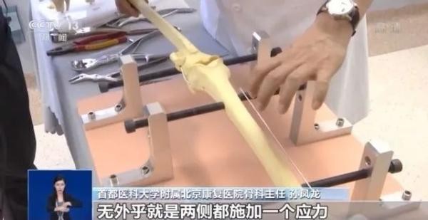首都医科大学附属北京康复医院骨科主任孙凤龙:你看我们的骨骼是这样的,然后不论是哪种形式的罗圈腿,我们给它施加绑带的应力的时候,无外乎就是两侧都施加一个应力,让腿变得更直,那么看我们现在施加一个应力,你看这个腿是有变形的,看到吗,这个骨头是有一定的变形的,但是我们在外力一去除的时候,它又回来了,因为骨头是有一定弹性的,骨头不是橡皮泥,不是说我们随便塑形的。