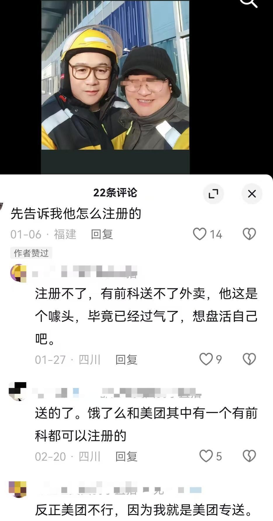 也有的网友认为,这只是高虎为了复出所想出来的噱头,而且,有前科的人送不了外卖。一位从事美团专送的网友也表示,这种人根本就不可能注册的了外卖的账号。