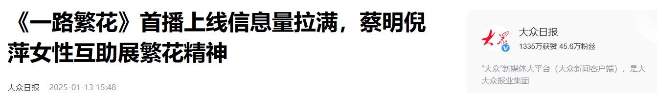 信源2:大众日报2025-01-13 15:48 《一路繁花》首播上线信息量拉满,蔡明倪萍女性互助展繁花精神