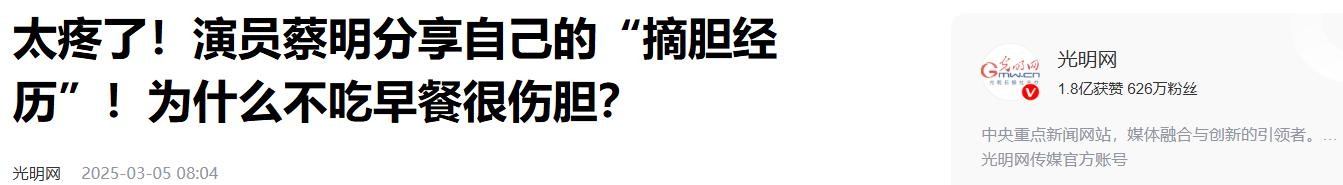 信源1: 光明网2025-03-05 08:04 太疼了!演员蔡明分享自己的“摘胆经历”!为什么不吃早餐很伤胆?