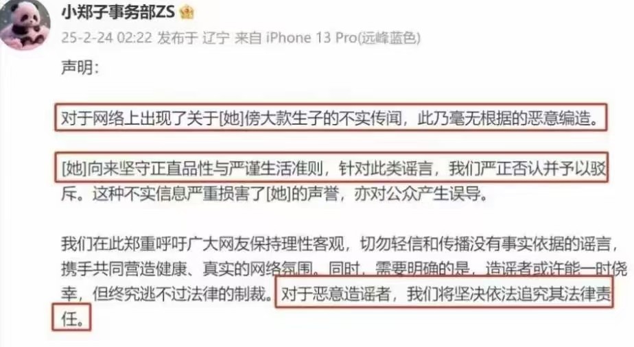 在这件事情闹的沸沸扬扬时,郑爽这边的工作室也坐不住了,一个被大家公认是郑爽工作室的社交媒体账号发出声明,对于现在网络上谣传郑爽被包养成小三,还怀孕的消息都是虚假消息,让大家抵制谣言的传播。
