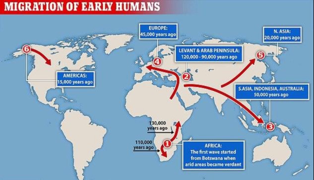 除了这次发现的足迹证据,表明了智人的迁徙路线和时间以外,我们通过对全球各个地区的人的基因进行测定。
