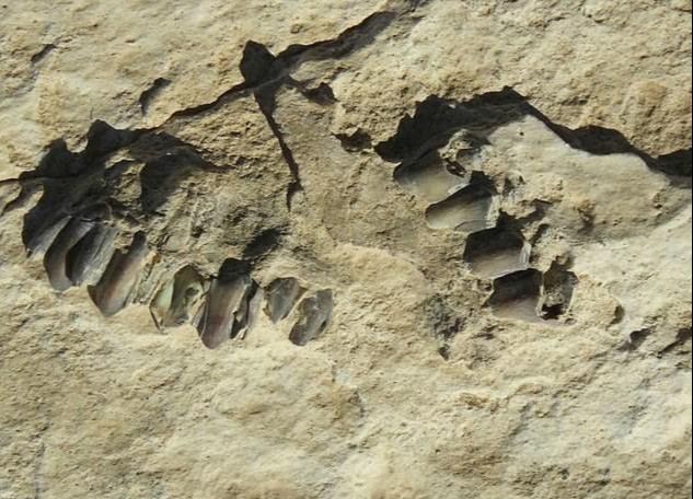 上图是古河床底部逐渐被风化侵蚀,显露出来的动物化石。