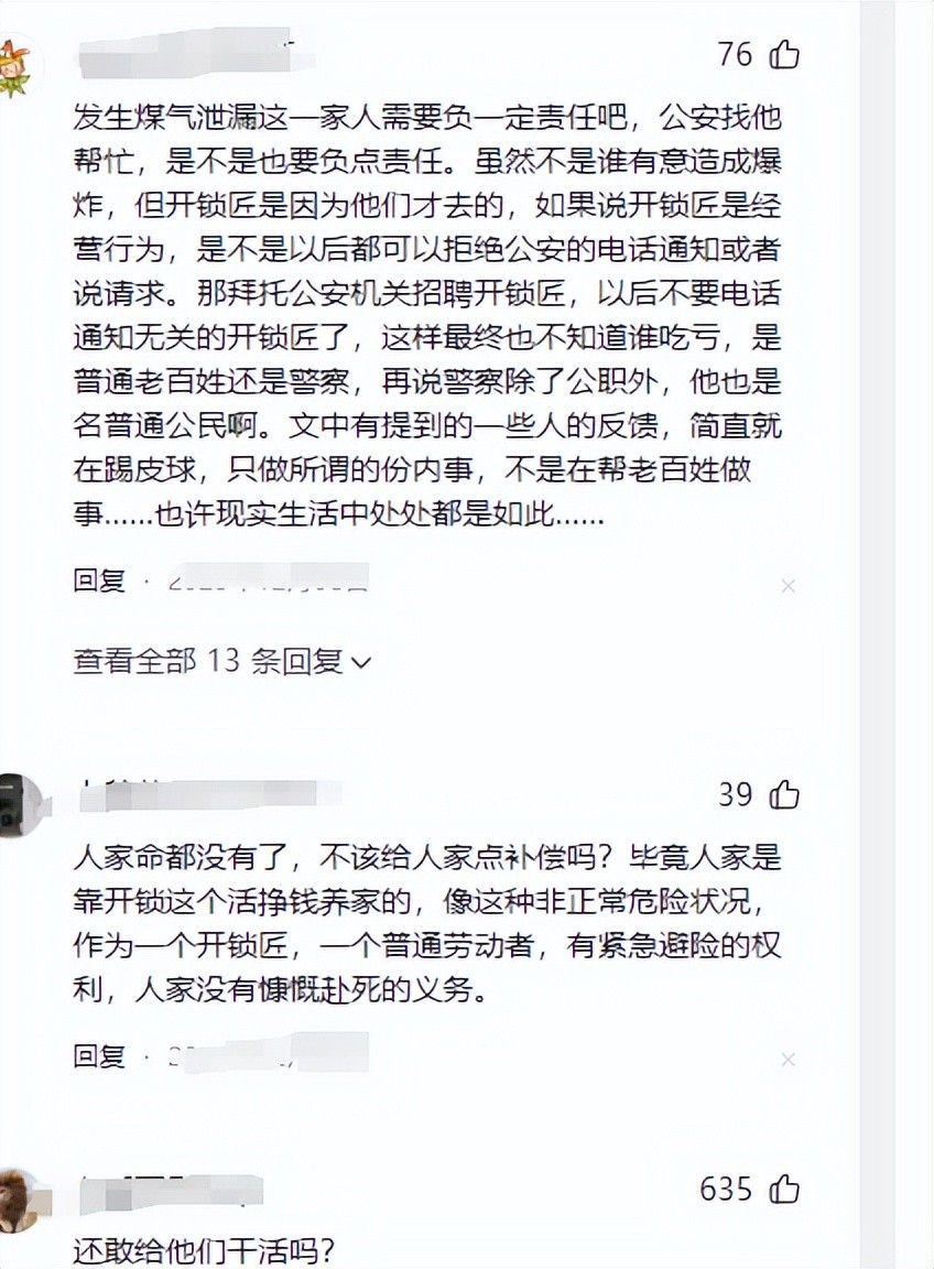 要知道,煤气爆炸被波及的住户,每家还领到了政府每月6000元的补贴,但这个被民警拉来,参与危险开锁任务的锁匠丢失性命,却没有任何的补贴。