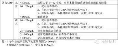 细菌感染:当细菌感染时,88%~94% 的患者 CRP 超过 50mg/L,80% 的患者 CRP 超过 100mg/L。当 CRP 水平为 10~99mg/L 时多提示局灶性或浅表性感染,≥100mg/L 时多提示脓毒症或侵袭性感染。抗感染治疗过程中,动态监测 CRP 水平的变化可辅助判断疗效,CRP 下降至正常可作为停药的指标之一。