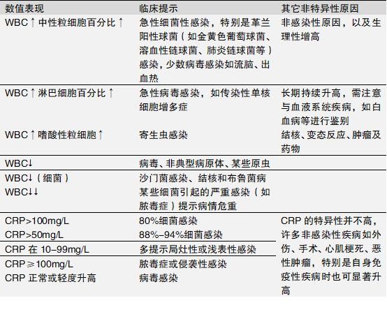 血WBC易受年龄、日间变化、妊娠与分娩、药物治疗等因素的影响;而CRP不受生理、免疫状态、药物治疗等影响。幼儿的血白细胞灵敏,白细胞大于10×109/L,而CRP阴性,感染尚属轻浅。