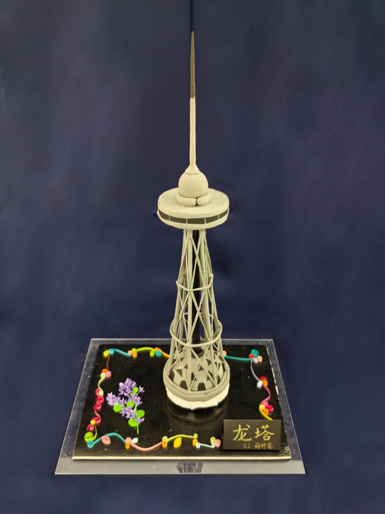 来自哈尔滨市南马路小学校的薛梓睿获奖作品是《龙塔》,他说:“第九届亚冬会将在我的家乡冰城哈尔滨举办,作为东道主,我想用小制作来展现家乡最美的城市形象,什么建筑能代表家乡呢?在我脑海里马上浮现出来——龙塔。龙塔是哈尔滨的地标性建筑,塔楼高达336米,是亚洲第一高钢塔,同时代表着传统与现代融合。在制作龙塔过程时,为了逼真、环保,我用到了很多意想不到的物品,比如塔座用到了杯盖,观光电梯用到了粗吸管等等;为了确保作品与实物更接近,我将竹签、塔座、圆盘都裹上灰色的彩泥,这样更符合钢的颜色;龙塔的“钢索”是用彩泥搓成细线做成的,不小心就会弄断,所以安装钢索时要非常有耐心,最终龙塔搭建成功。”