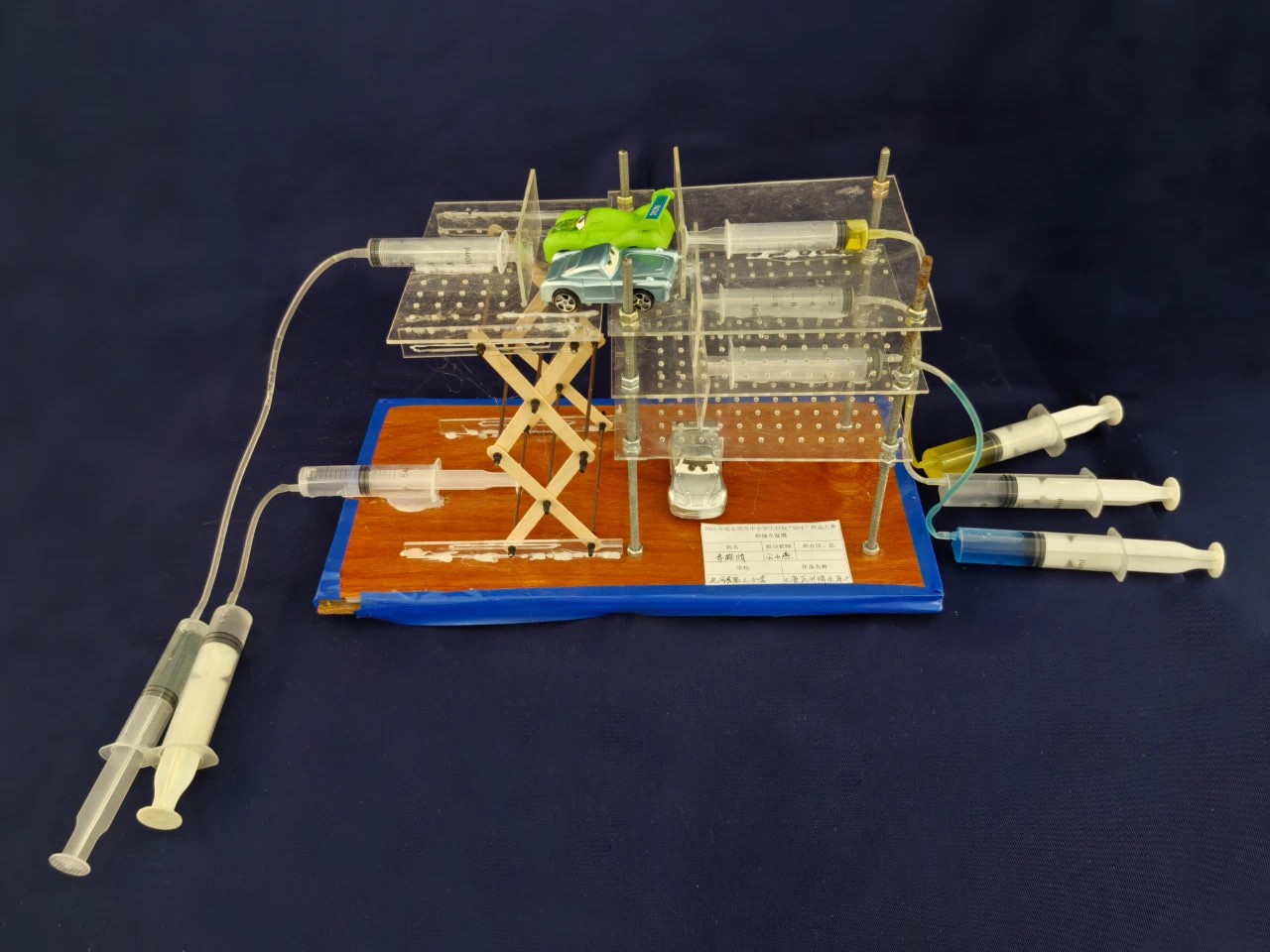 通河县第三小学乔路晴的获奖作品《是液压升降车库》。“随着人们生活水平的提高,私家车越来越多,但是停车位却供不应求,每天晚上小区的道路两边都停满了车辆,所以我就想设计一种液压升降车库,能实现同样的占地面积,却可以停放更多的车辆。” 来自通河县第三小学的乔路晴说到。“我制作了三层液压升降车库,它是由车库和液压升降台两部分组成,其中升降台运用到剪叉式结构,让车辆实现垂直升降;用一根软管连接两个注射器,其中一个注满水,推送有水的注射器,就会发现另一个注射器的活塞就会被推出来,这个装置作为液压升降车库推送装置;再把无水注射器固定在升降台的平面上,把注射器的活塞头固定在升降台推拉杆上,这样升降台就做好了;同理在每层车库上安装液压推送装置,这样就可以利用液压升降和液压传送来完成车辆的升降和存放。”她还表示,通过参加这次科技“四小”作品大赛,学到了很多知识,感受到了科学的魅力和制作的快乐。