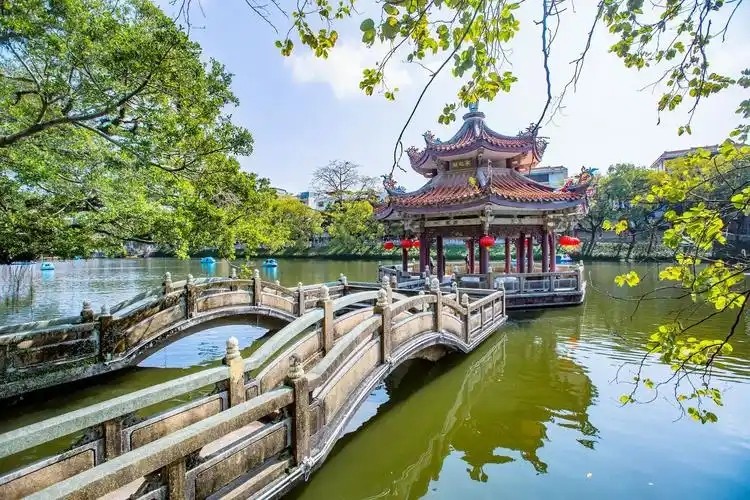 5、西湖公园。依山傍水,昔日古城护城河。位于潮州市湘桥区环城西路与中山路交叉口。今日是潮州古城的护城河,俗称城豪池。小巧别致,有山、湖,有石刻,还有革命遗迹,也可泛舟湖上。潮州西湖是古城区一片碧绿的园林。里面有儿童乐园,有摩崖石刻,还有革命纪念馆,是一个功能齐全的市民公园,还有潮州八景之一的西湖鱼筏。