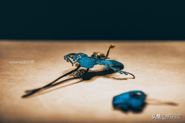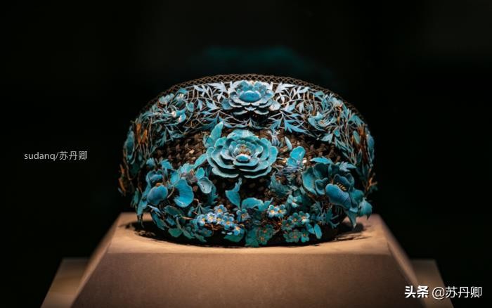 图为【点翠头簪】用于后妃发髻的固定和装饰,为单插头簪。同【黑缎嵌点翠凤戏牡丹女帽】一样,这点翠头簪十分醒目,颇受女性游客的喜爱。簪上部为点翠工艺制成的大朵牡丹花造型,相当形象,而且精致。关键是这花中嵌有一颗珊瑚小珠,色彩鲜明,有点睛之笔之感,令人惊艳。 相信喜欢穿汉服的年轻女孩若是见到了此头簪,一定欣喜不已。
