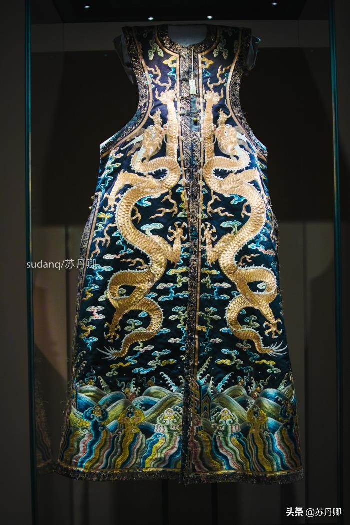 图为【石青缎彩绣平金龙纹女朝褂】是清宫皇后、太皇太后、皇太后、皇贵妃所穿用朝褂,穿着时套于朝袍之外。此朝褂对襟、圆领、无袖,类似今天的长款小马褂。但就这件朝褂足以看出穿者的崇高地位和显赫身份,不论正面还是背面,均有金线绣二龙戏珠纹,周围饰绣吉祥彩云。下幅为八宝寿山、江崖立水纹饰。