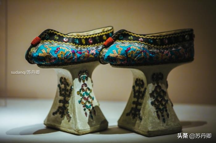 结合前图,穿好服饰,弄好发饰,佩上首饰,鞋子的搭配也很重要。图为【蓝缎彩绣暗八仙钉珠马蹄底鞋】这是清代宫剧中最常见的生活用品,但也是最不被注意的。对于该鞋子的最早认识,还是我第一次看《还珠格格》的时候。但在博物馆看到实物之后,突然发现这马蹄底鞋竟是这般精美华丽。鞋面用蓝、黑缎拼接而成,绣各种花纹,还钉有彩色斜珠。