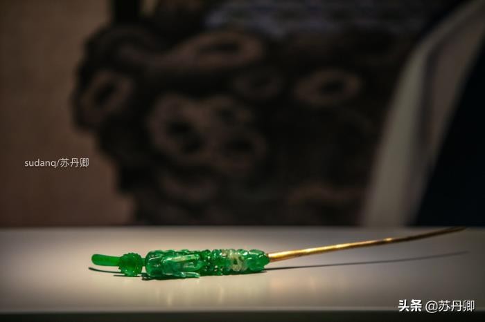 图为【透雕盘龙翡翠簪】后妃配饰。以盘龙造型为头,缠绕在银簪之上,将装饰性与实用性融为一体。此簪为清中期精品,不论是工艺还是选材都十分考究。