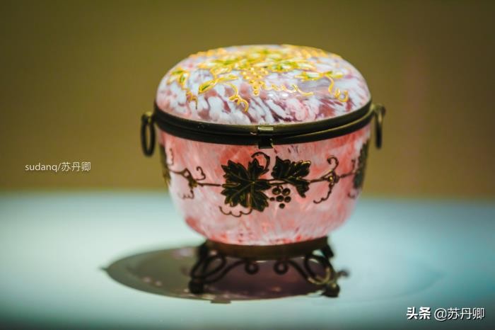 图为【粉玻璃葡萄花双环耳盒】看着像是清宫后妃放小饰品的盒子,为纯正的“清宫出品”。康熙三十五年,内廷设玻璃厂,从此开始了宫廷御用玻璃器的制造。乾隆时期,宫廷玻璃制造水平达到了顶峰。从造型和色彩都很清新,淡雅,既风华绝代又毫无轻浮之态。
