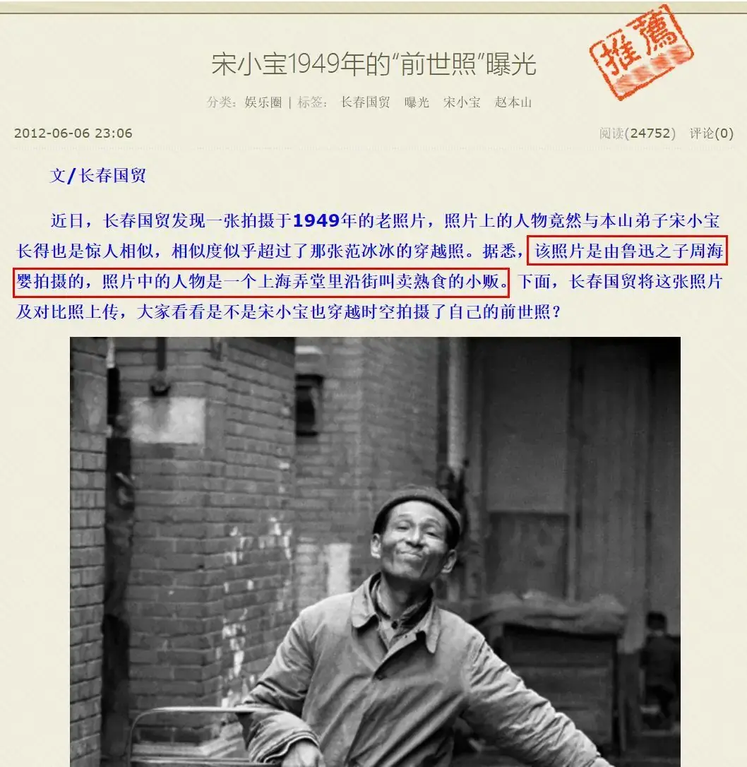 这个网文的题目叫《宋小宝1949年的“前世照”曝光》。里面明确表示:“该照片是由鲁迅之子周海婴拍摄的,照片中的人物是一个上海弄堂里沿街叫卖熟食的小贩。”