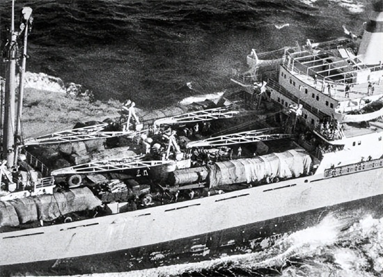 这样美国在与苏联的博弈中就会始终面临卧榻之忧。因此苏联方面从1962年7月中旬起就开始在古巴实施核导弹部署计划:载有3500名军事技术人员以及导弹和核弹头的苏联舰船悄悄驶向古巴。这些核弹的威力要比广岛原子弹大25倍。为了不让美国方面发现,所以行动一直在秘密进行,然而天底下就没有不透风的墙。尽管苏联和古巴一直在秘密采取行动,然而1962年8月美国还是发现了苏联设在古巴的导弹发射场。