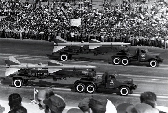 20世纪五六十年代的苏联在与美国的争霸斗争中实际上处于守势。1961年美国在意大利和土耳其都部署了导弹基地。如果再加上部署在联邦德国的导弹基地和一批轰炸机基地足以使苏联所有工业中心都处在美国的核弹打击范围之内。50年代后期的美苏军备竞赛中美国拼命扩充其核武库使美国得以在苏美核竞赛中处于领先地位。尽管美、苏两国同为当时的超级大国,但实际上美国的实力在当时仍是要明显强于苏联的。