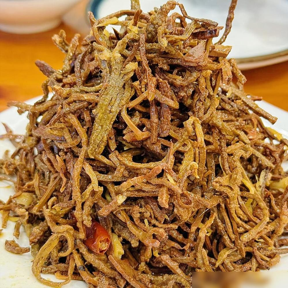 相较于崩肝的切丝工艺来说,它的刀工更加狠辣,再加上调料的搭配更是有说不出的美味,让人只想多吃几口,所以油盐鸡精等基础调料它们从不小气,十分慷慨地放进去。