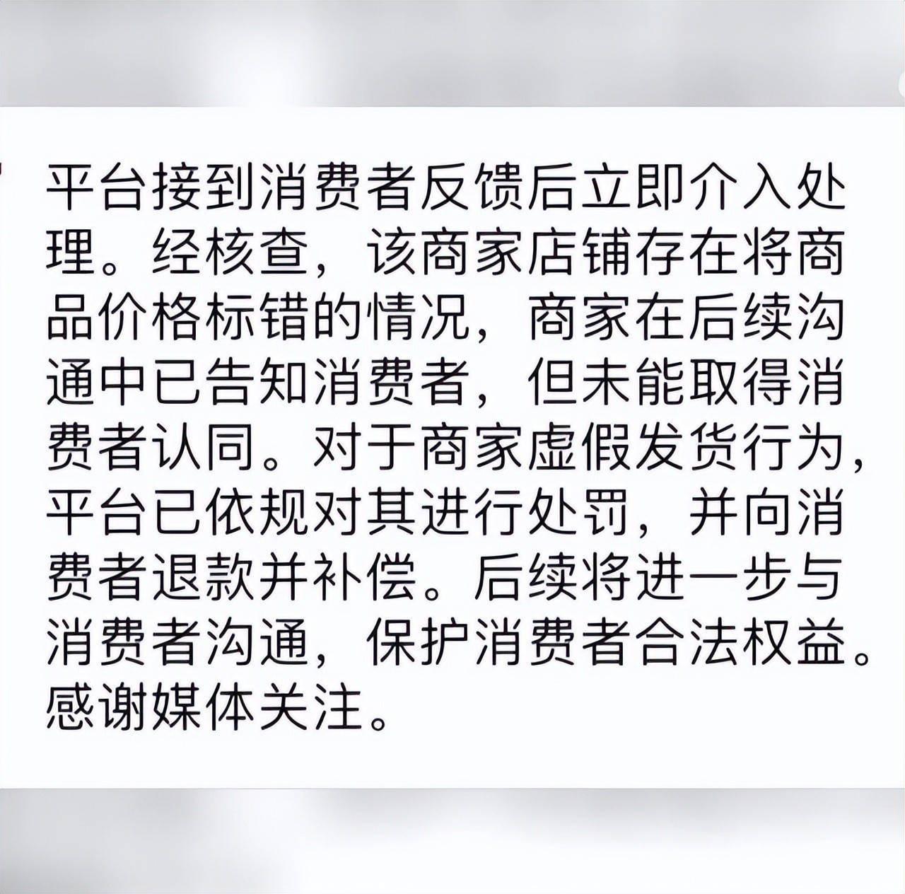 平台最终做出了支持退款的决定。他们认为,商家存在将商品价格标错的情况,而且未能诚实回应消费者的问题。这种行为被平台定性为虚假发货行为,根据平台规则,商家将受到相应处罚。