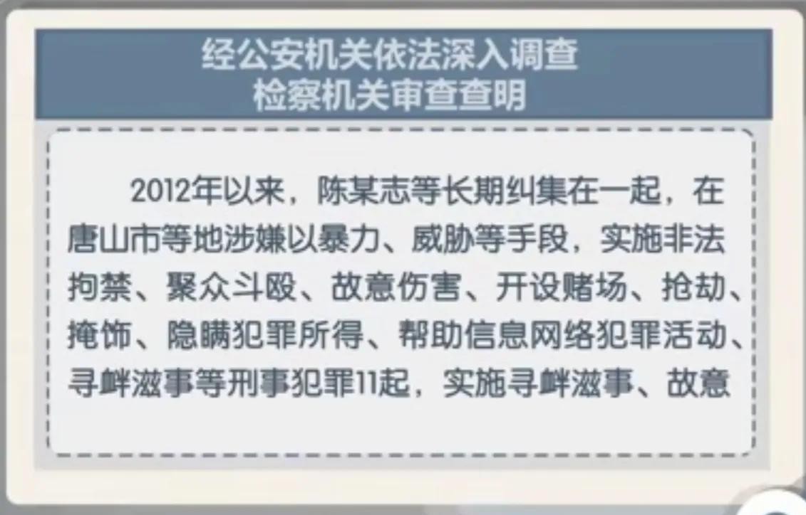 经公安机关的深入调查,从2012年以来,陈某志等人长期纠集在一起,在唐山等地以暴力、威胁等手段,实施非法拘禁、聚众斗殴、故意伤害、开设赌场、抢劫、掩饰、隐瞒犯罪所得、帮助信息网络犯罪活动、寻衅滋事等刑事犯罪11起,故意伤害等行政违法4起,逐渐形成了以陈某志为纠集者得恶势力组织。