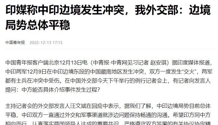 2022年12月,印度媒体发布了一则“假新闻”,称12月9日在藏南地区,中印双方再次爆发,双方均有人员受轻伤。