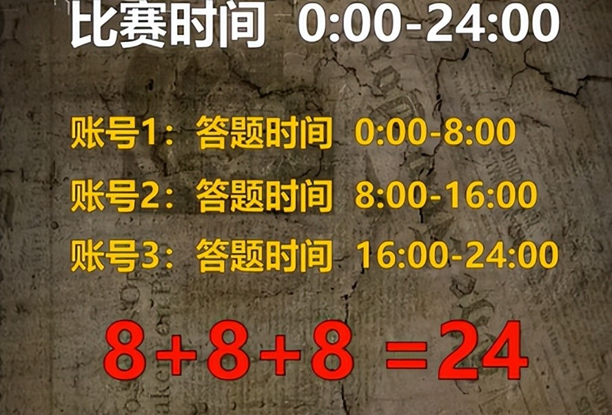 具体怎么操作?比如说你可以用第一个账号在0点到8点开始答题,再用第二个账号在8点到16点答题。那么第二个账号答题的时候,就能够直接先抄第一个账号已经完成的部分答题。以此类推,如果你有三个决赛账号,那么在决赛当天你就可以有24个小时的答题时间,是其他选手的三倍。