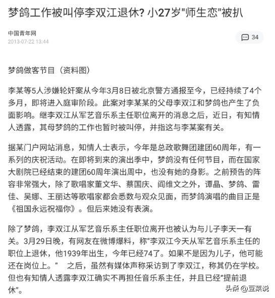 信息来源:中国青年网2013.7.22——梦鸽工作被叫停李双江退休?小27岁"师生恋"被扒