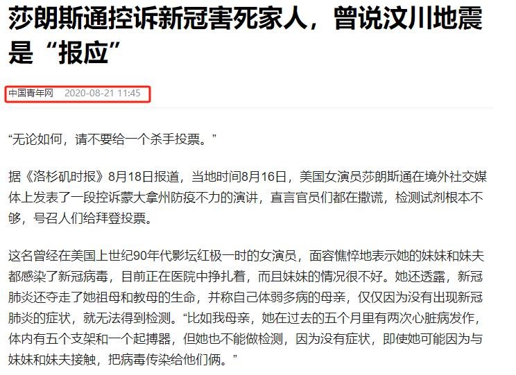 中国青年网2020-08-21莎朗斯通控诉新冠害死家人,曾说汶川地震是“报应”