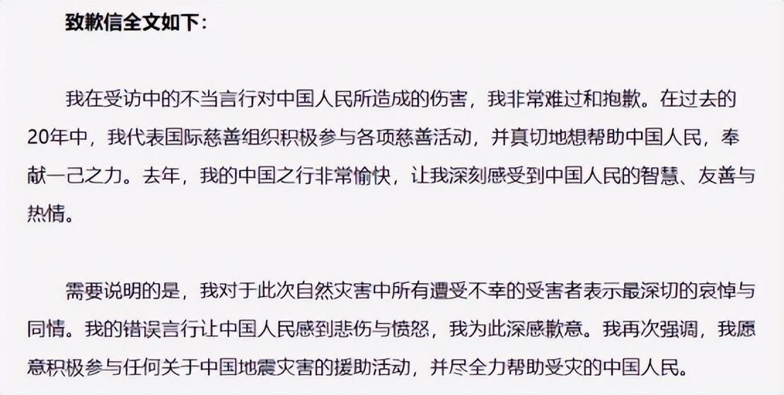 她对中国人民表示了道歉,称此前的言论是出于口误,然而这样不真诚的道歉是让人不能接受的。