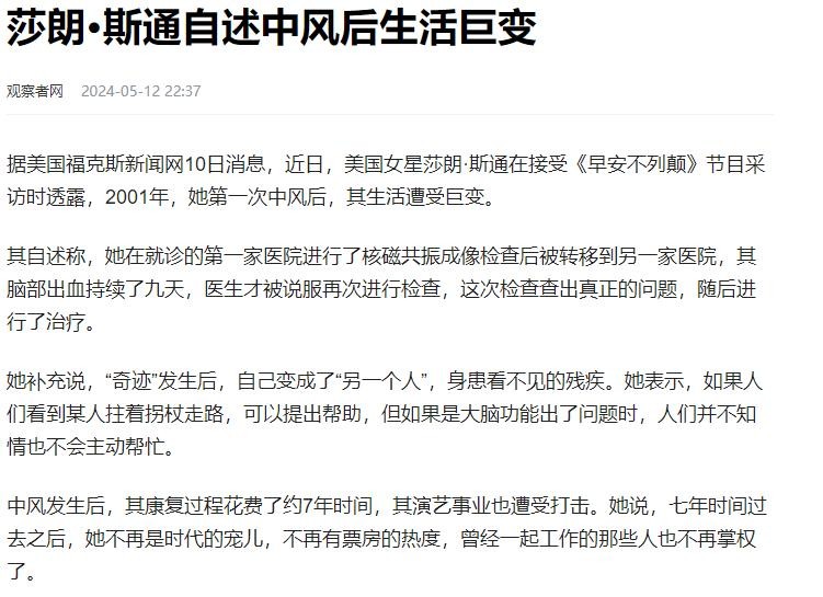 观察者网2024-05-12莎朗·斯通自述中风后生活巨变
