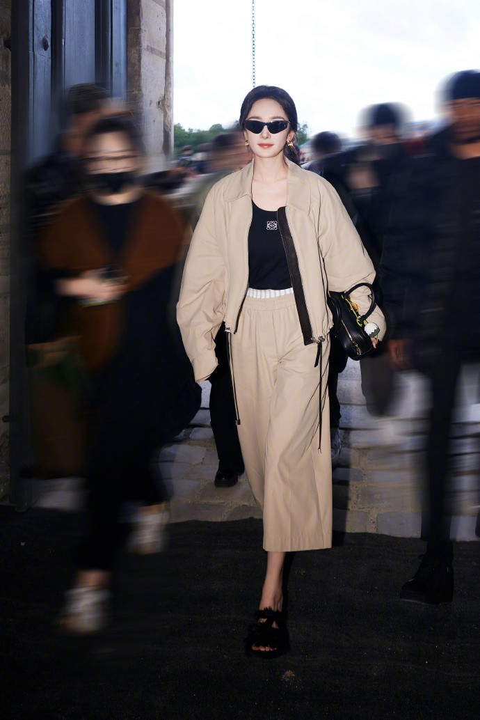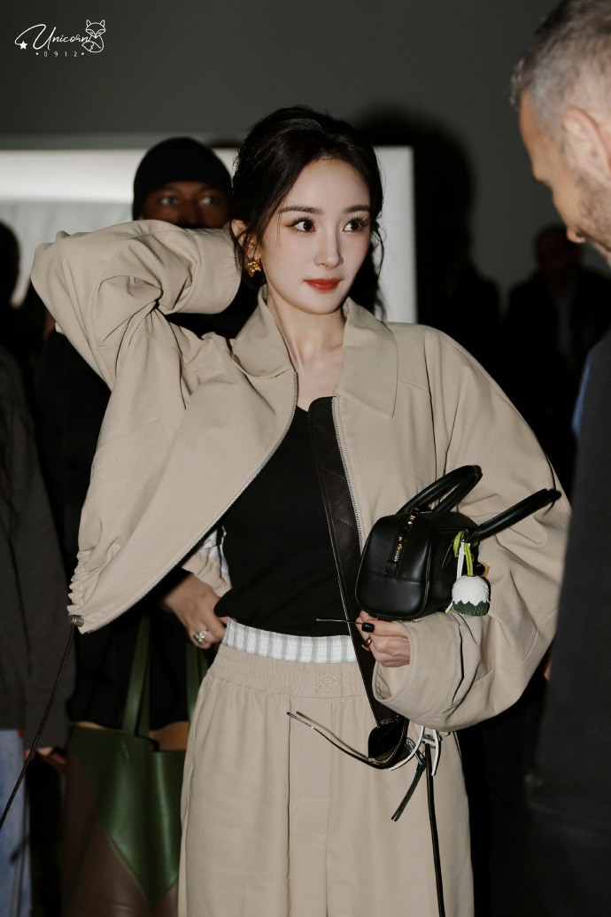 作为Loewe全球品牌代言人,她身穿2025早春系列卡其色套装,抛弃了以往最爱的各种裙装礼服,首次尝试米色裤装套装,压轴出席了品牌2025春夏大秀。