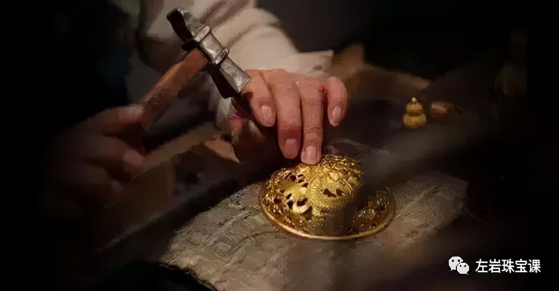 古法黄金借助搂胎,锤碟,修金,錾刻,花丝,镶嵌,浇铸,锻打、浮雕、打磨等传统加工手法。