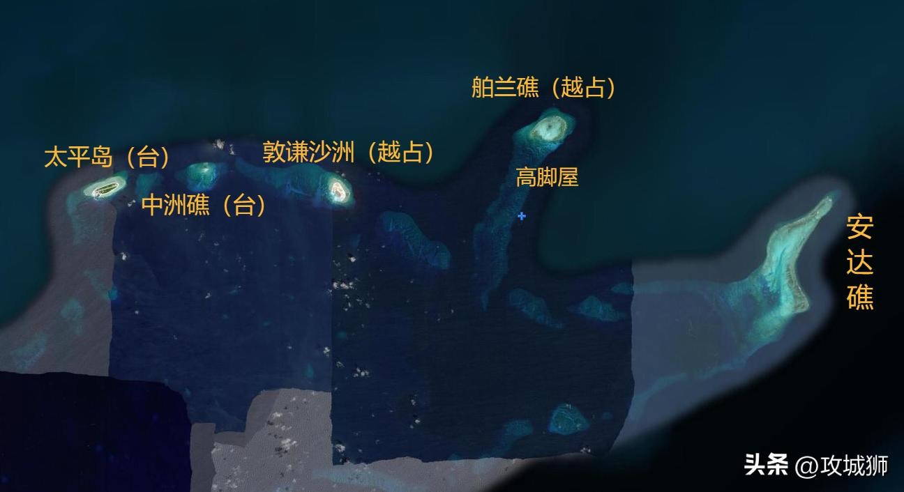 从卫星图来看:在安达礁的西侧有2座岛礁被越南控制,舶兰礁被越南占领没有填海造陆但上面有士兵驻守的高脚屋;敦谦沙洲越南正在填海造陆,上面有密密麻麻的房屋;西边还有2个岛礁为台湾省控制。