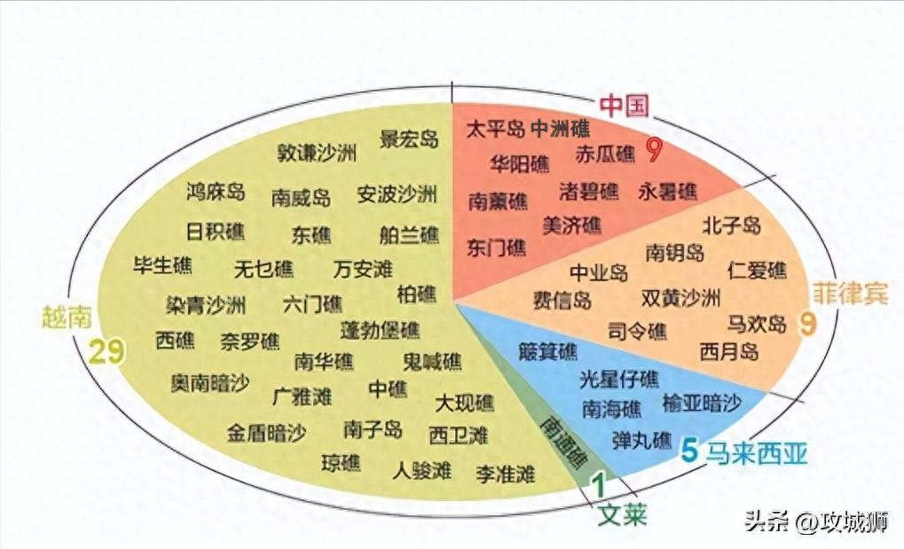 大家公认的南沙群岛实际控制情况为:越南侵占了29个,菲律宾侵占了9个,马来西亚侵占了5个,文莱侵占了1个,我国(含台湾省)占领了9个:华阳礁、赤瓜礁、渚碧礁、永暑礁、美济礁、东门礁、南薰礁、太平岛(台)、中洲礁(台)。但南沙群岛总共有230多座岛屿、沙洲、暗礁、暗沙和暗滩,扣除以上名花有主的53座岛礁,其实我们还有许多控制的岛礁,但国内却鲜有人知道。