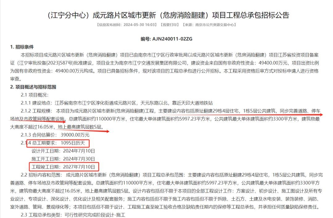 今年5月,南京公共资源交易中心发布“成元路片区城市更新(危房消险翻建)项目工程总承包招标公告”。