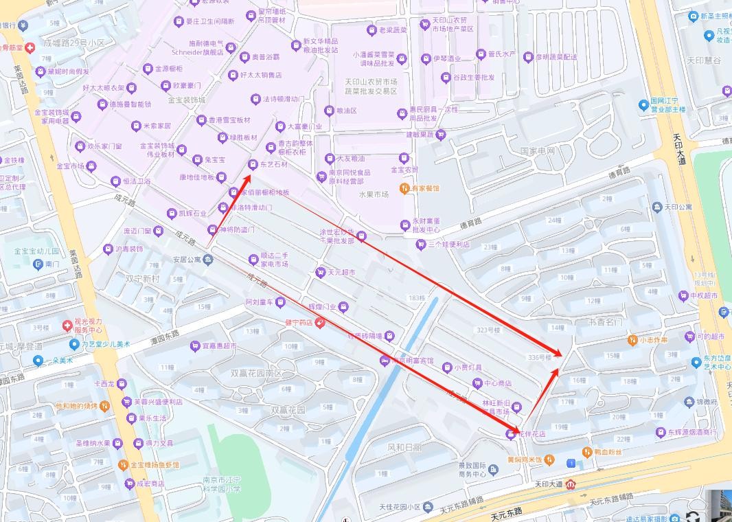 根据招标公告,江宁成元路将被拆除的片区东至书香名苑,西至双赢花园,南至天元东路,北至金宝装饰城。靠近1号线天印大道地铁站,旁边就是天印山农贸市场、金宝市场。