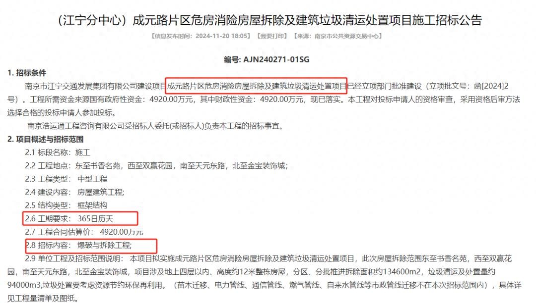 内容显示,江宁成元路片区将被爆破拆除,所需的4920万元已经落实,工期为一年。
