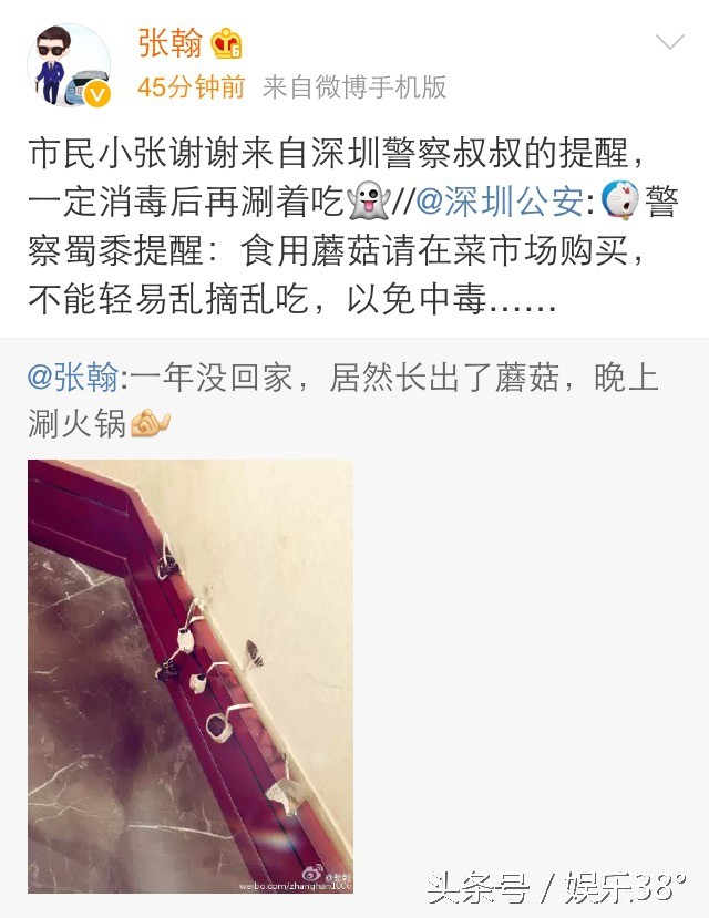 张翰调侃自家长出蘑菇,深圳公安神回复,网友:调皮的警察叔叔!
