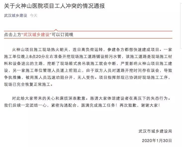 武汉城乡建设局发布关于火神山医院项目工人冲突的情况通报