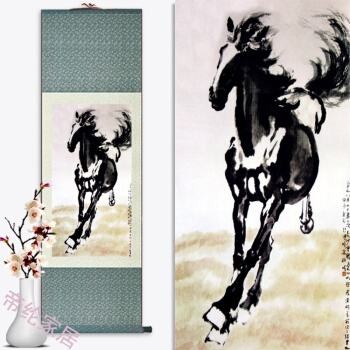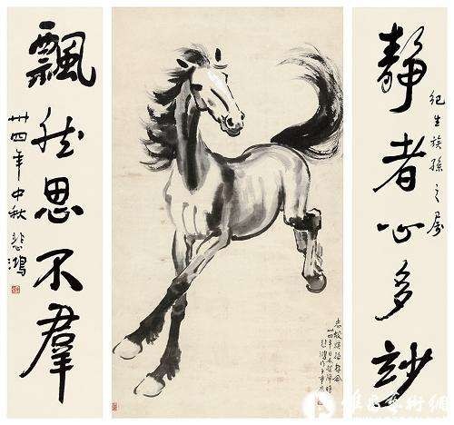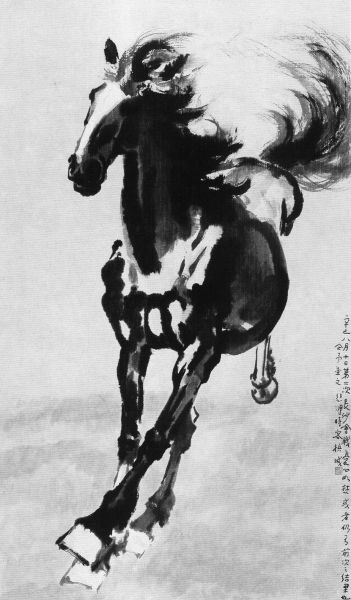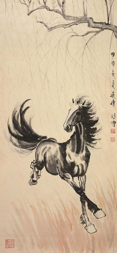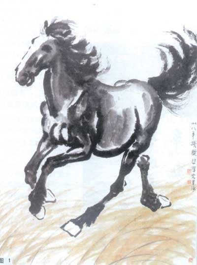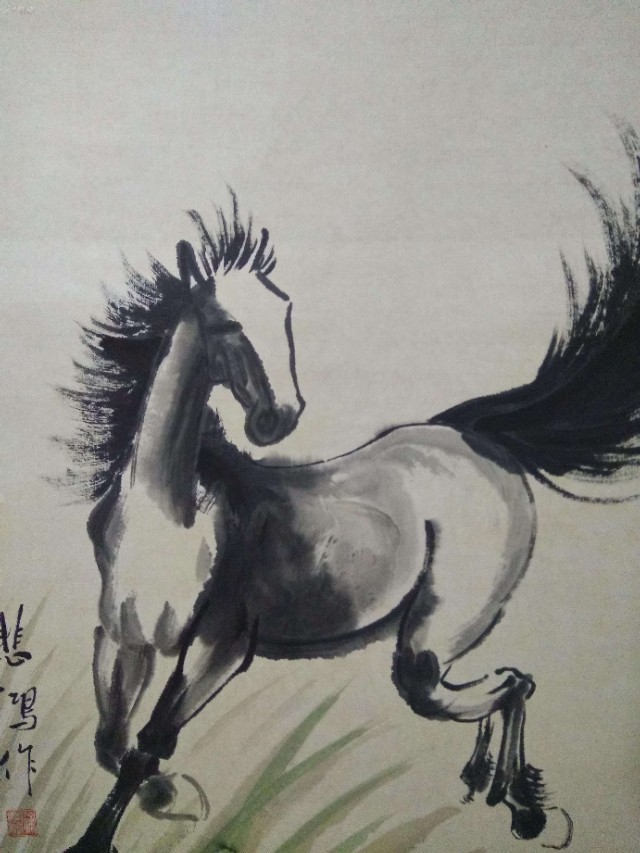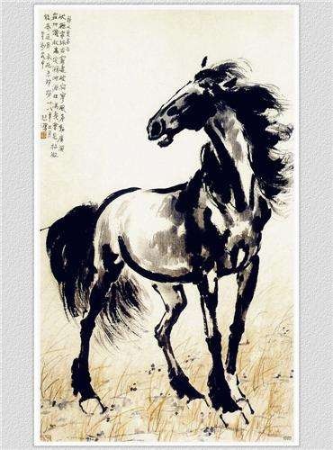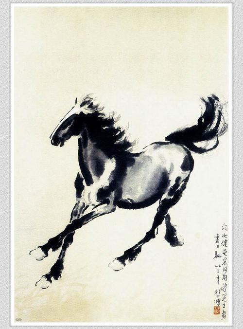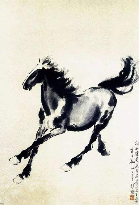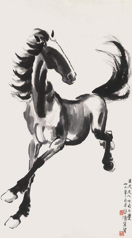 徐悲鸿自幼随父学习绘画,四岁入私塾。后又留洋法国,深得西洋绘画的技法,并系统学习了西方绘画的理论,在西方素描的透视关系、空间关系、光影关系的处理上驾轻就熟,并将西方的绘画理论与东方绘画的技法结合起来,产生了独特的笔墨效果。徐悲鸿所画的奔马图以形神兼备著称,奔马的神韵跃然纸上,整体造型俊朗丰满。