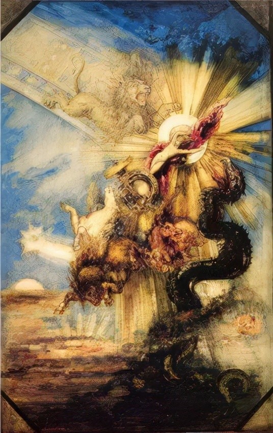 在莫罗的这幅作品中,法厄同的马车在天空中乱窜,惊扰了许多星座。所以,在油画中,我们能看见左边是狮子座,右边是冒着黑烟的巨蛇昂起头来想要吞吃法厄同的样子。