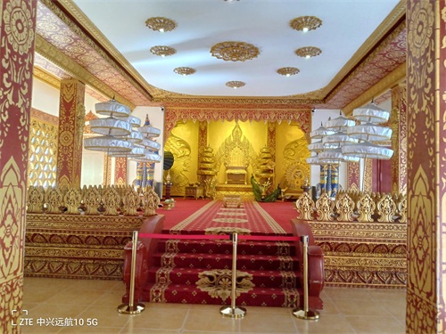 傣王的行宫,是从前傣王议事、休息的地方,曼听公园曾是傣王的御花园,有1300多年的历史了,傣王的行宫也已经有800多年的历史。傣王是世袭制的,一辈一辈传承下来。到了1950年解放了,刀世勋作为最后的一位傣王,将自己的权利上交给了国家,从此,他就跟普通的傣族人民一样,过起了正常的市民生活,曾任云南省政协副主席。2017年去世,享年89岁,他的墓地就在总佛寺。